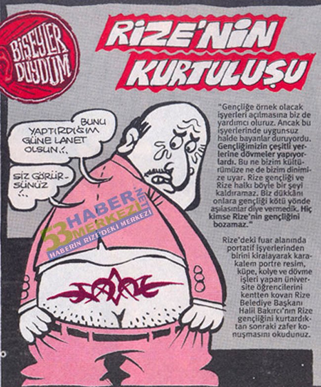 Geçtiğimiz günlerde gündeme gelen ve Rize Belediye Başkanı Halil Bakırcı'nın Deniz Caddesi üzerinde kurulu olan fuardan dövmeci stantını kaldırttığına ilişkin haber, Türkiye'nin önemli mizah dergilerinden "Uykusuz" tarafından karikatürize edildi.