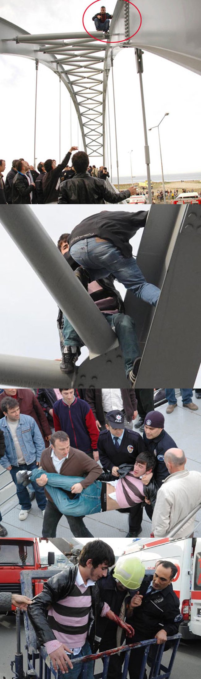 Hakkı A. da bir süre daha bulunduğu yerden inmedi. 25 metre yükseklikte üst geçitte ayakta yürüyen genç olayı izleyenlere korku dolu anlar yaşattı. Hakkı A., olay yerine gelen bazı arkadaşlarının ikna etmesi ile bulunduğu yerden indi.