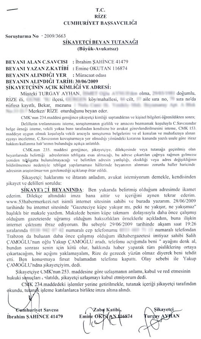 Tehdit dolu ses kaydı ve daha önce İlkhaber Gazetesi’nde çalıştığını ispatladığına dair belgelerle birlikte Rize Adliyesi’ne giden Turgay Ayhan, Gazete Sahibi’nin oğlu Yakup Çamoğlu hakkında suç duyurusunda bulundu.